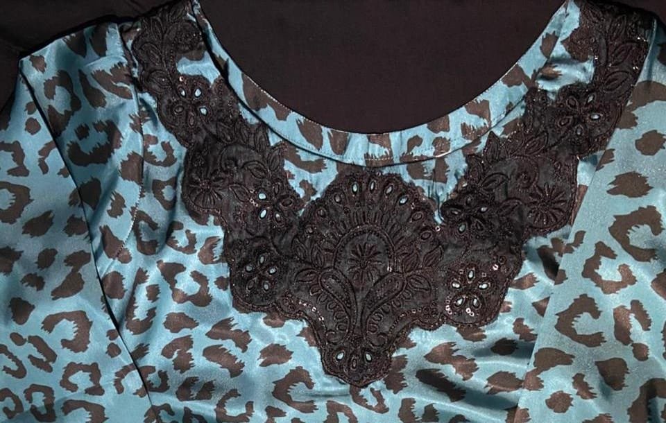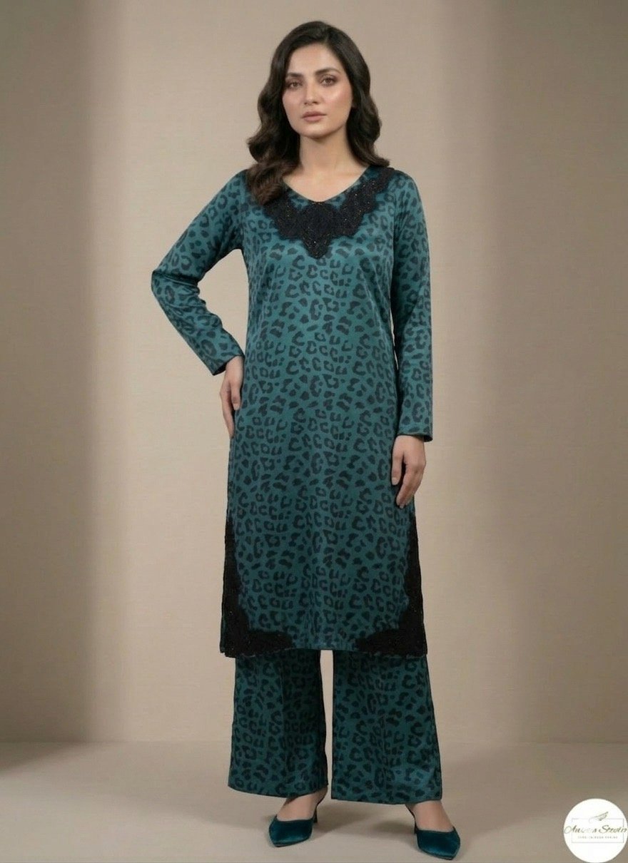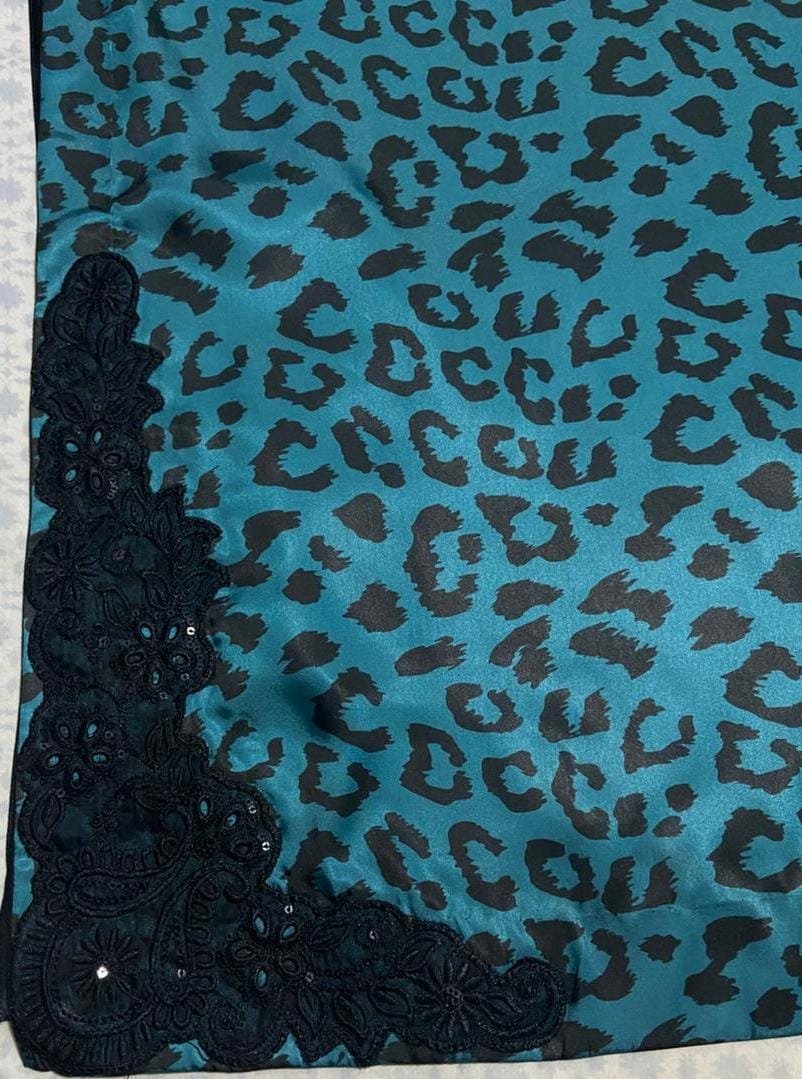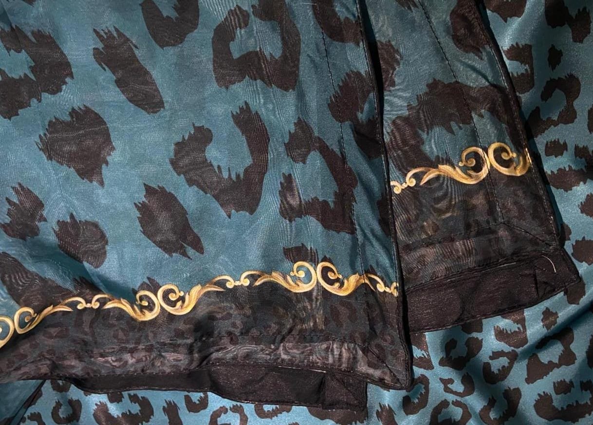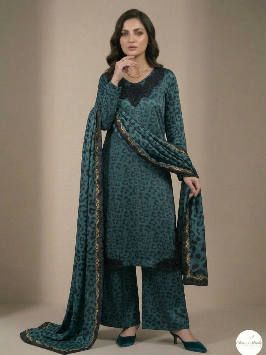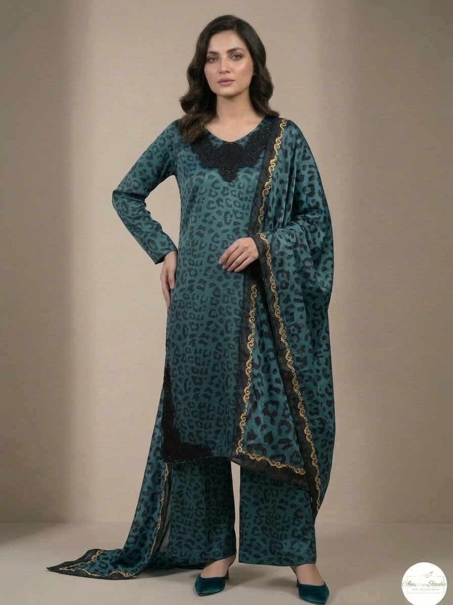 Step into effortless style with this 3-piece leopard print teal dress. The shirt features black organza embroidered patches elegantly placed on the neckline and hem, adding a subtle yet striking contrast to the vibrant print. The wide straight trousers are crafted from the same fabric and pattern as the shirt, creating a coordinated and comfortable look. Completing the ensemble is a chiffon dupatta adorned with a delicate border on all sides, enhancing the overall elegance. Perfect for festive occasions or stylish daytime gatherings, this set combines contemporary design with traditional craftsmanship.