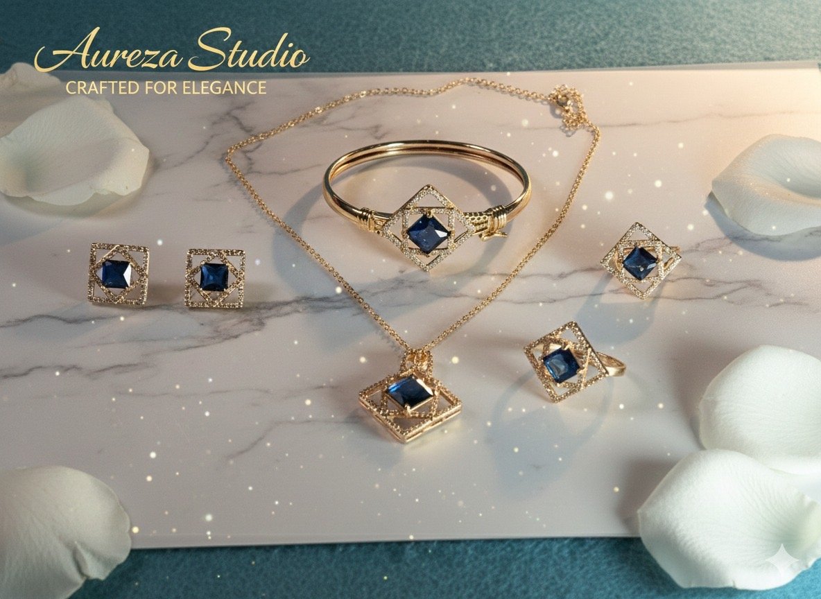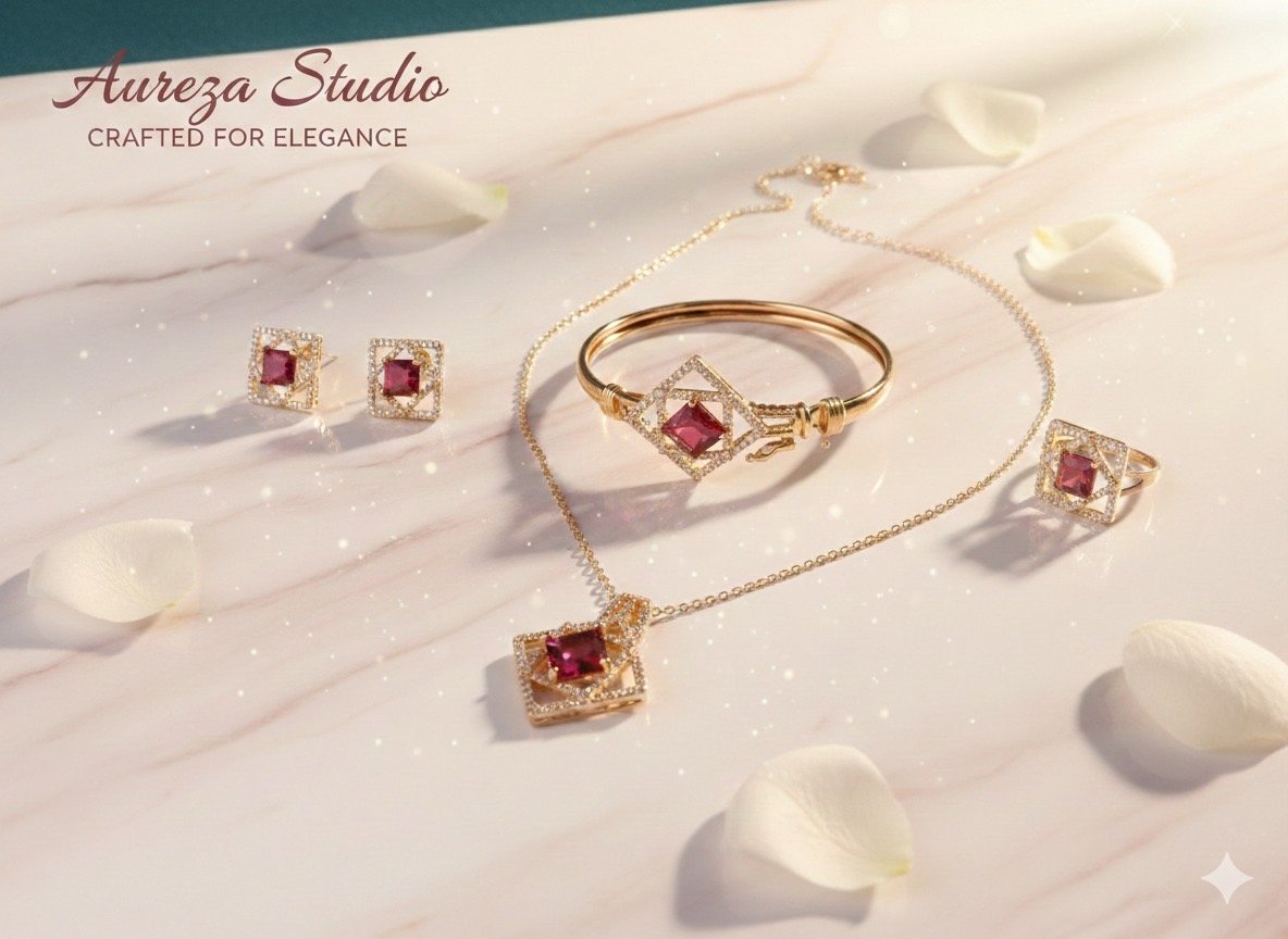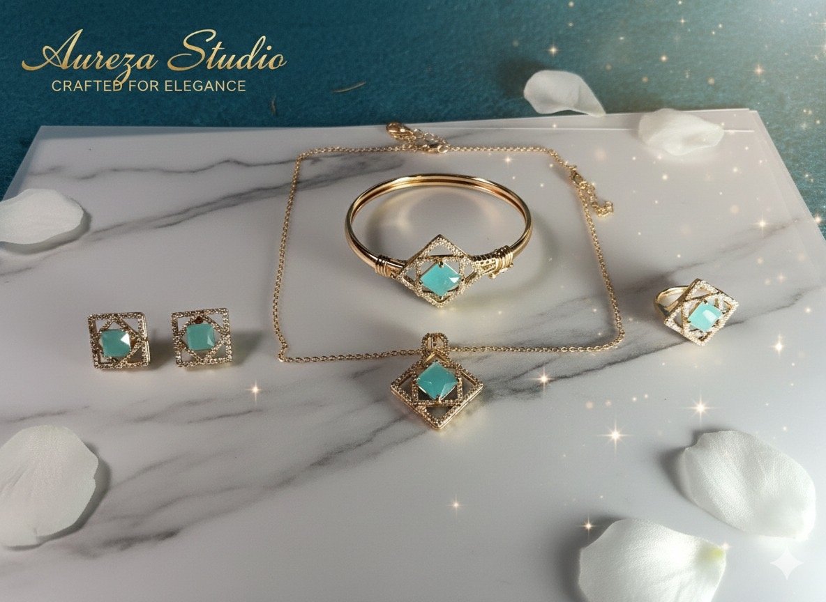 Why choose one when you can have the complete look? The Aureza Studio Quad-Set is designed for the woman who appreciates effortless coordination. Each piece in this collection—the elegant locket, the structured bangle, the statement ring, and the classic stud earrings—shares a unified design language of “Elegance Redefined.”