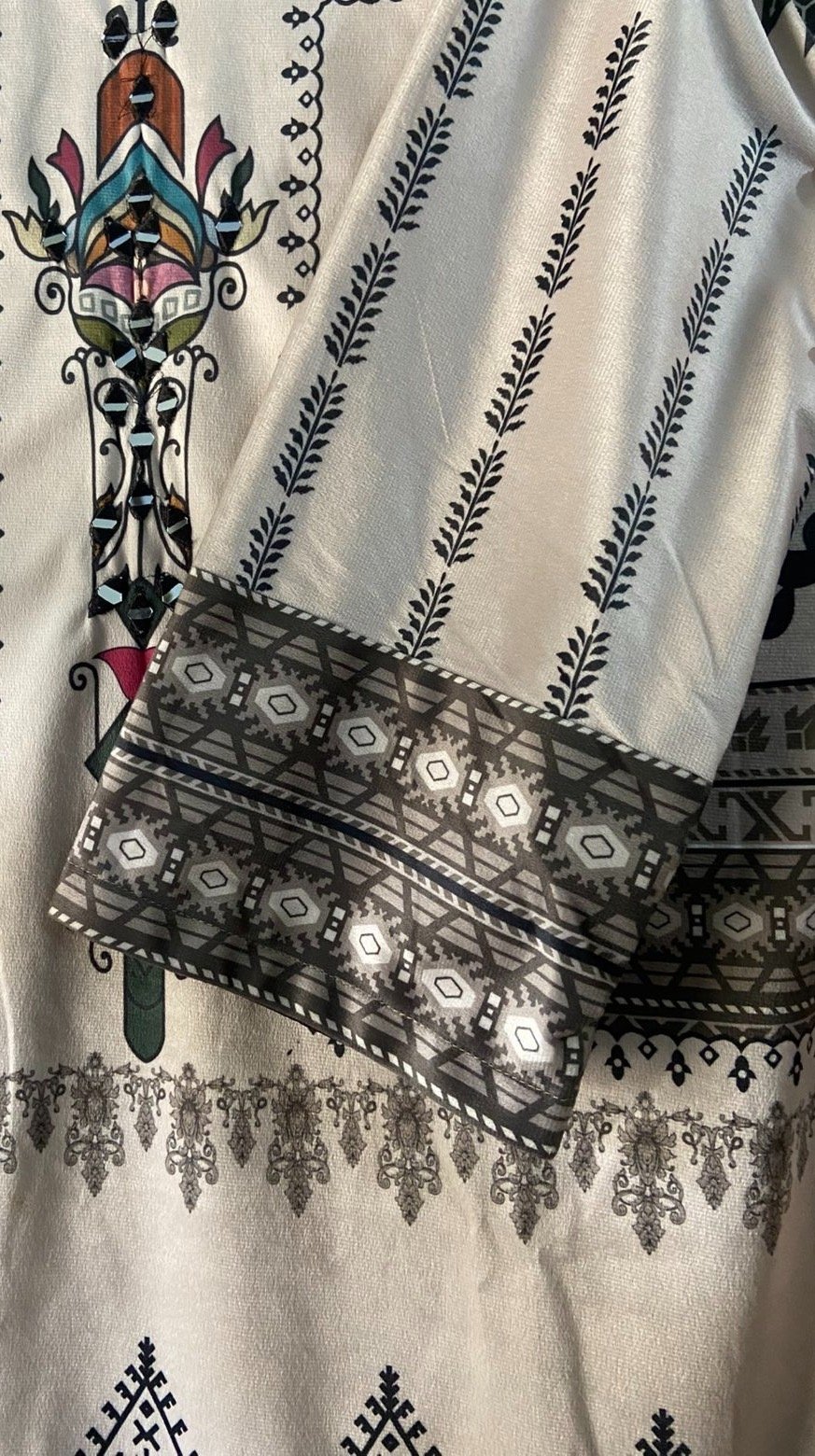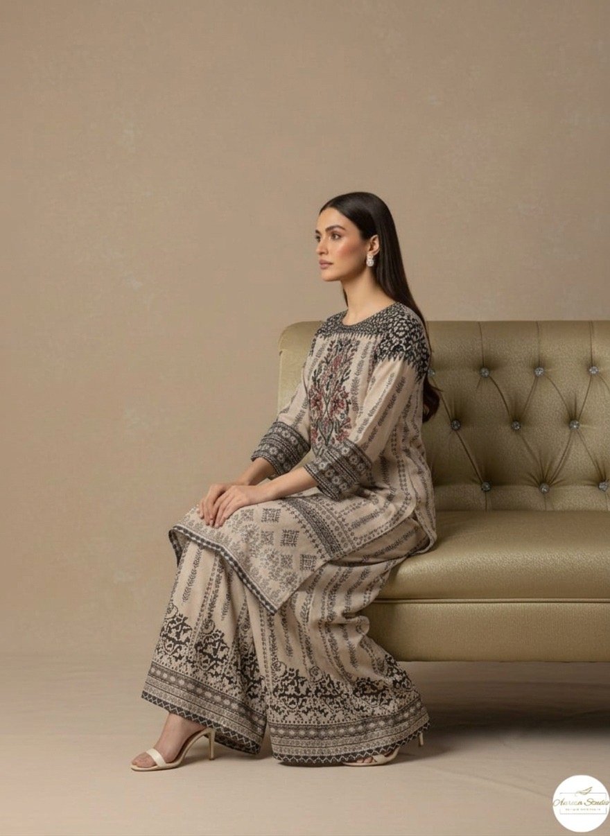 Step into timeless elegance with this beautifully designed velvet ensemble. The shirt features a soft beige base adorned with intricate traditional prints in deep earthy tones, creating a sophisticated and graceful look. Delicate mirror work embellishment near the neckline adds a subtle sparkle and enhances the overall charm of the outfit.